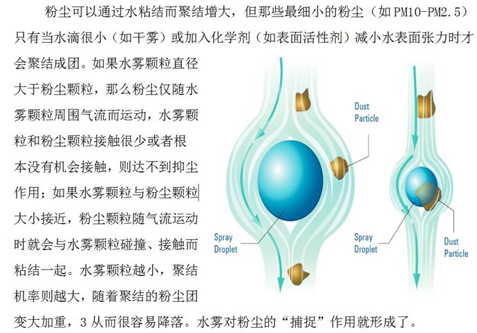 綜上所述,當水霧顆粒的粒徑與粉塵顆粒的粒徑大小相近,且霧量較大時(shí),空氣中的水蒸汽迅速飽和,飽和的水蒸汽與粉塵碰撞、接觸并凝聚在一起,達到一定的重量后沉降下來(lái)。這 是微米級干霧抑塵技術(shù)的除塵原理。