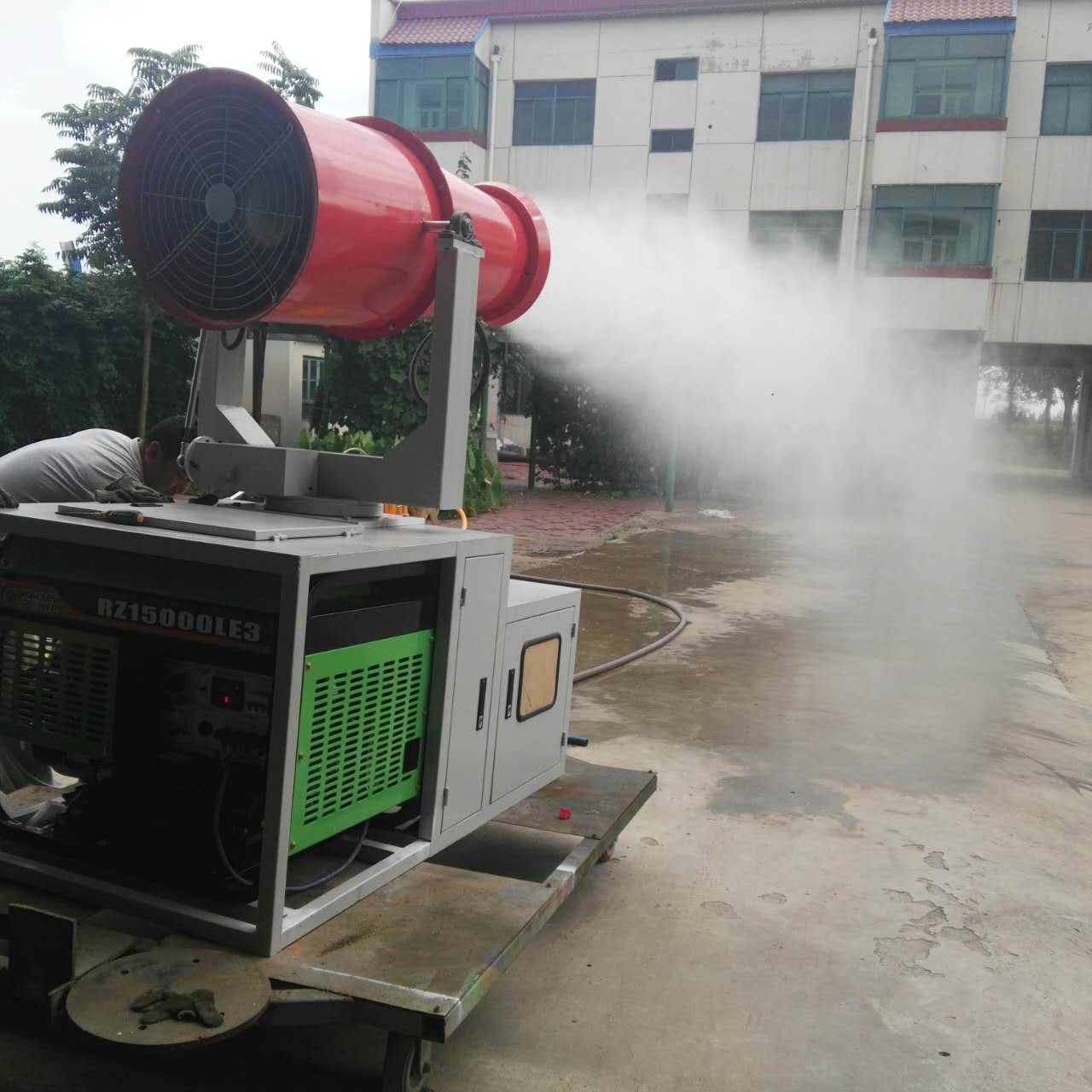 霧泡機通過(guò)高壓將水霧化成微米級的水霧顆粒,與粉塵顆粒物大小相當,與城市中的霧霾碰撞、吸附,凝結成粉塵團并沉降。