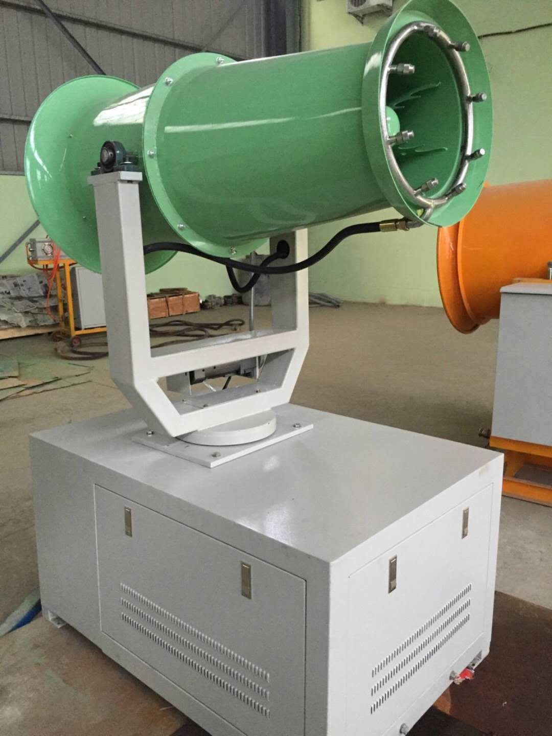 1.功率小、能耗低;在對噴嘴多年的研究基礎上對霧炮進(jìn)行了反復的試驗研究,采用了風(fēng)機變頻啟動(dòng),PLC控制,液壓轉動(dòng)。在同等功率下噴霧設備噴的 遠、耗能 低、性能 穩定。