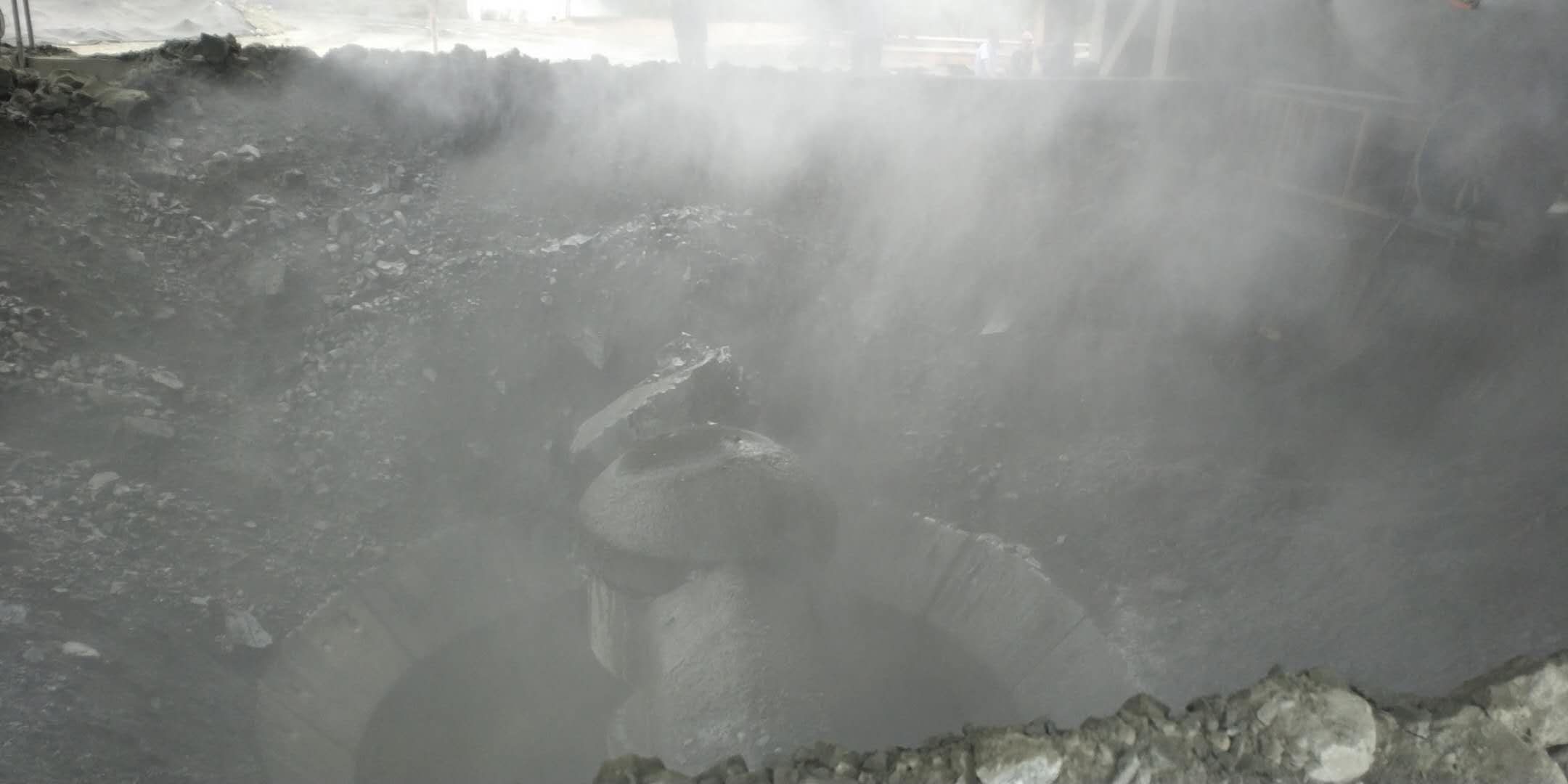 霧流在高速氣流的沖擊下分散度 好,當噴射霧流射入產(chǎn)塵空間時(shí),將產(chǎn)塵空間 覆蓋,在水霧射流與含塵氣流之間的接觸、擴散、凝結和重力沉降作用下,達到噴霧降塵的目的。