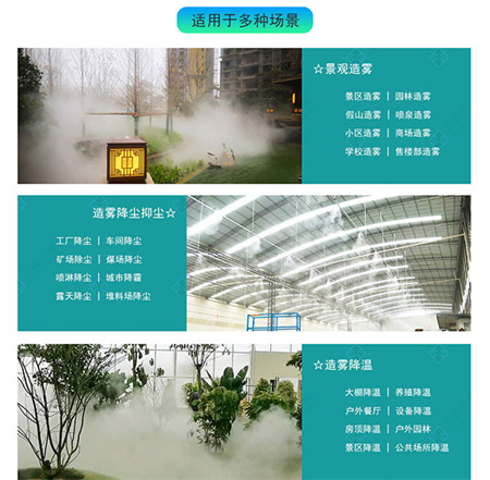 景區造霧、園林造霧、假山造霧、噴泉造霧、小區造霧、商場(chǎng)造霧、學(xué)校造霧、售樓部造霧。
