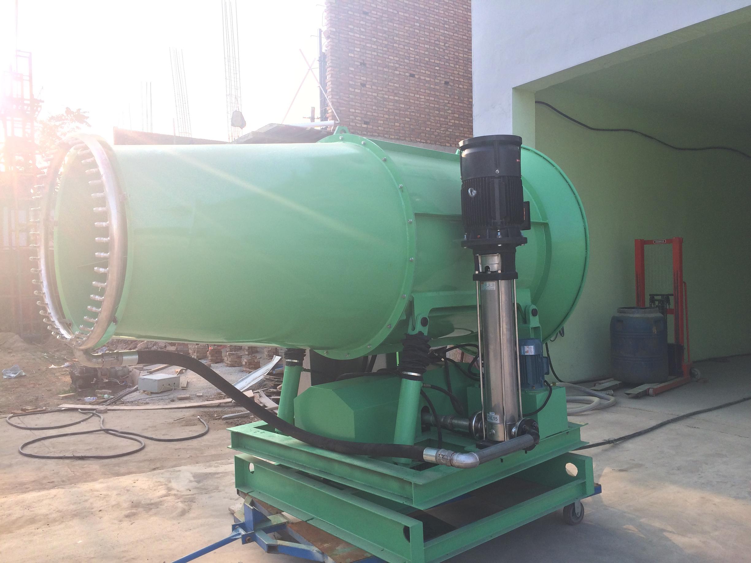 除塵噴霧機又稱(chēng)風(fēng)送式噴霧機,風(fēng)送式噴霧機是以三缸柱塞泵或者立式離心泵為第一次動(dòng)力把水從噴霧頭噴出霧化,然后以風(fēng)機吹風(fēng)為第二次動(dòng)力將霧化的水高射程的揚出,因而稱(chēng)為風(fēng)送式噴霧機,風(fēng)送式噴霧機的射程遠近主要在風(fēng)機的設計和動(dòng)力上,風(fēng)機扇葉的角度材料,風(fēng)筒的流線(xiàn)型,進(jìn)風(fēng)口,出風(fēng)口的細節設計都制約著(zhù)噴霧機的射程。