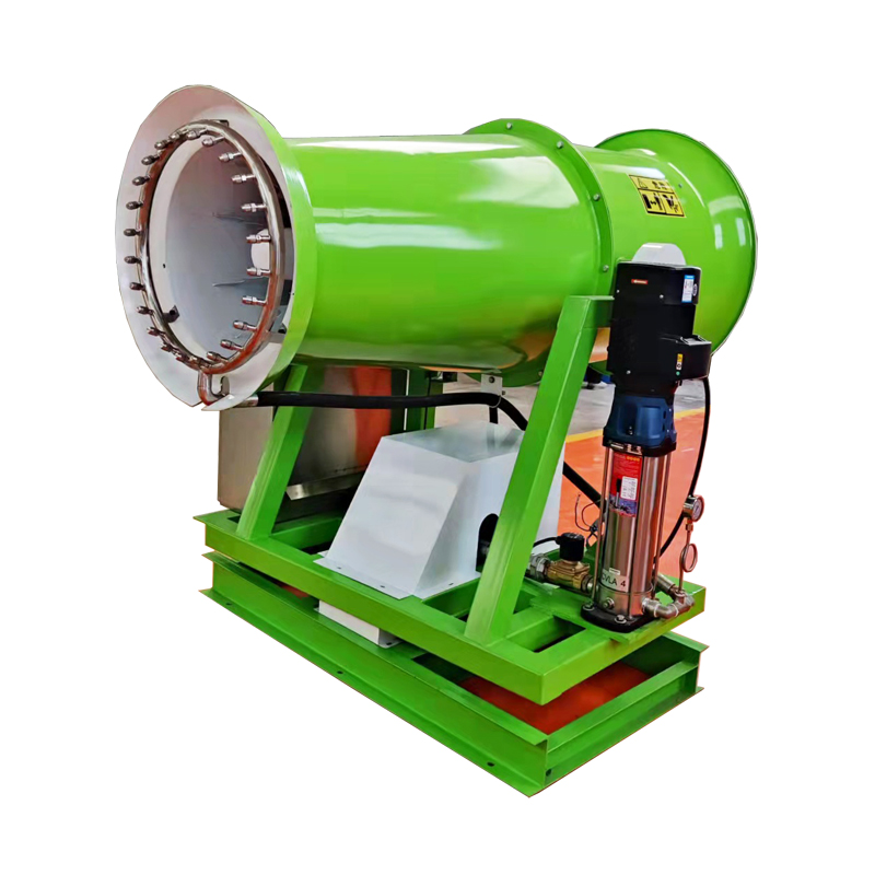 霧炮機的原理不難,利用壓力將水加壓成霧,再將霧噴射出風(fēng)機,霧與粉塵結合、吸附,加速粉塵降落,從而達到降塵的效果。